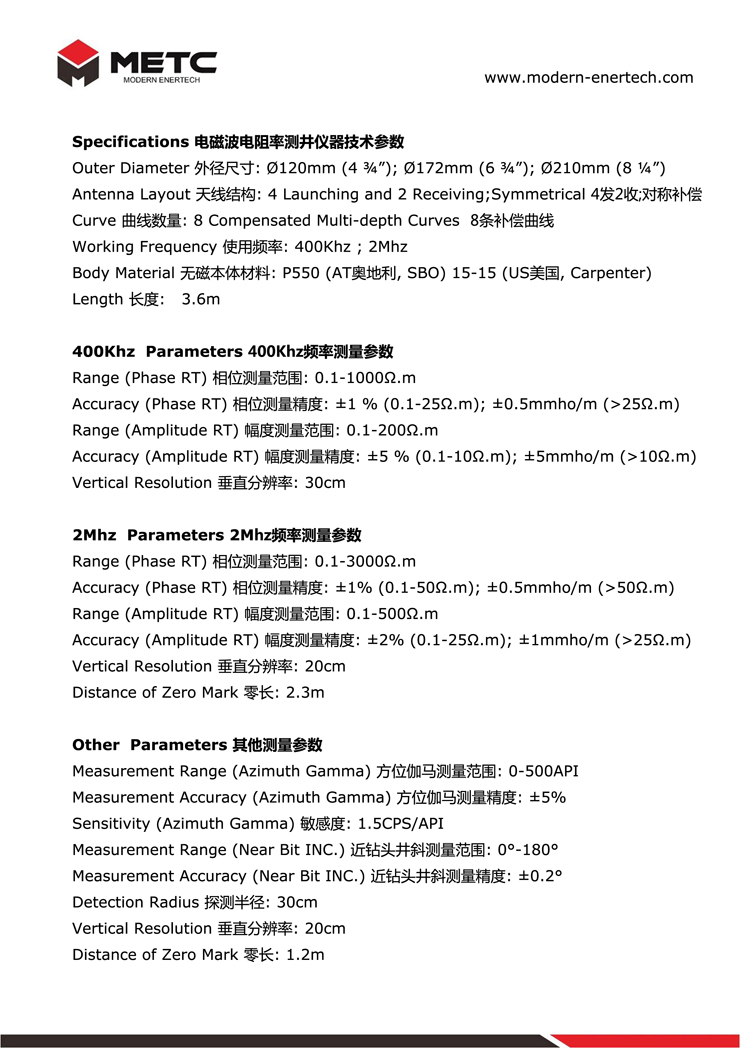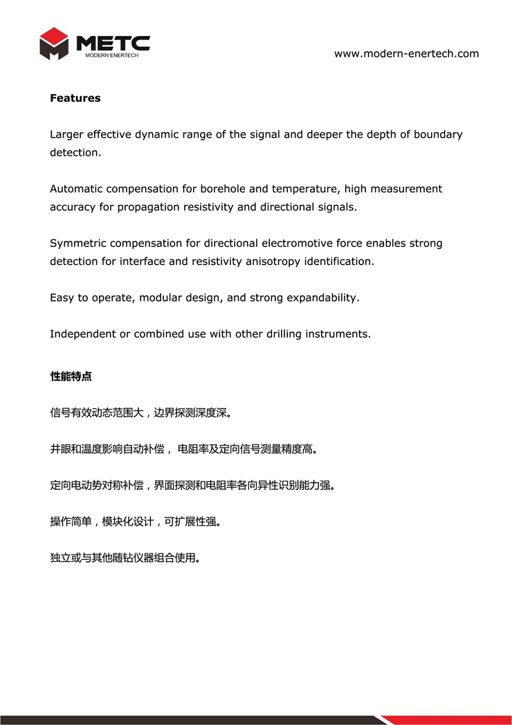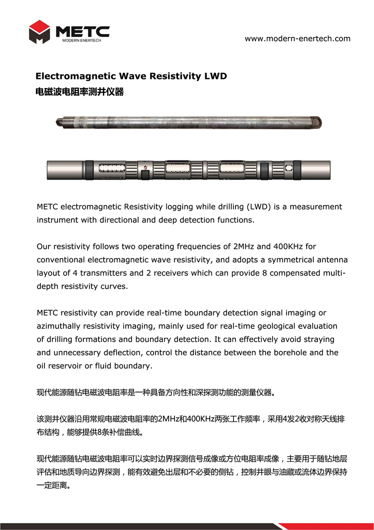 Каротаж удельного сопротивления электромагнитными волнами METC во время бурения (LWD) представляет собой измерительный прибор с функциями направленного и глубинного обнаружения. Наше сопротивление соответствует двум рабочим частотам 2 МГц и 400 кГц для обычного сопротивления электромагнитным волнам и использует симметричную схему антенн из 4 передатчиков и 2 приемников, которые могут обеспечить 8 компенсированных кривых удельного сопротивления с разной глубиной. Наше сопротивление может обеспечить изображение сигнала обнаружения границ в реальном времени или изображение азимутального сопротивления, которое в основном используется для геологической оценки буровых пластов в реальном времени и обнаружения границ. Он позволяет эффективно избегать отклонений и ненужных отклонений, контролировать расстояние между скважиной и нефтяным резервуаром или границей жидкости.